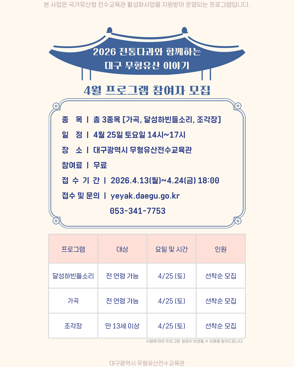 2026 전수교육관 활성화사업 '전통 다과와 함께하는 대구 무형유산 이야기' 4월 프로그램 참가자 모집