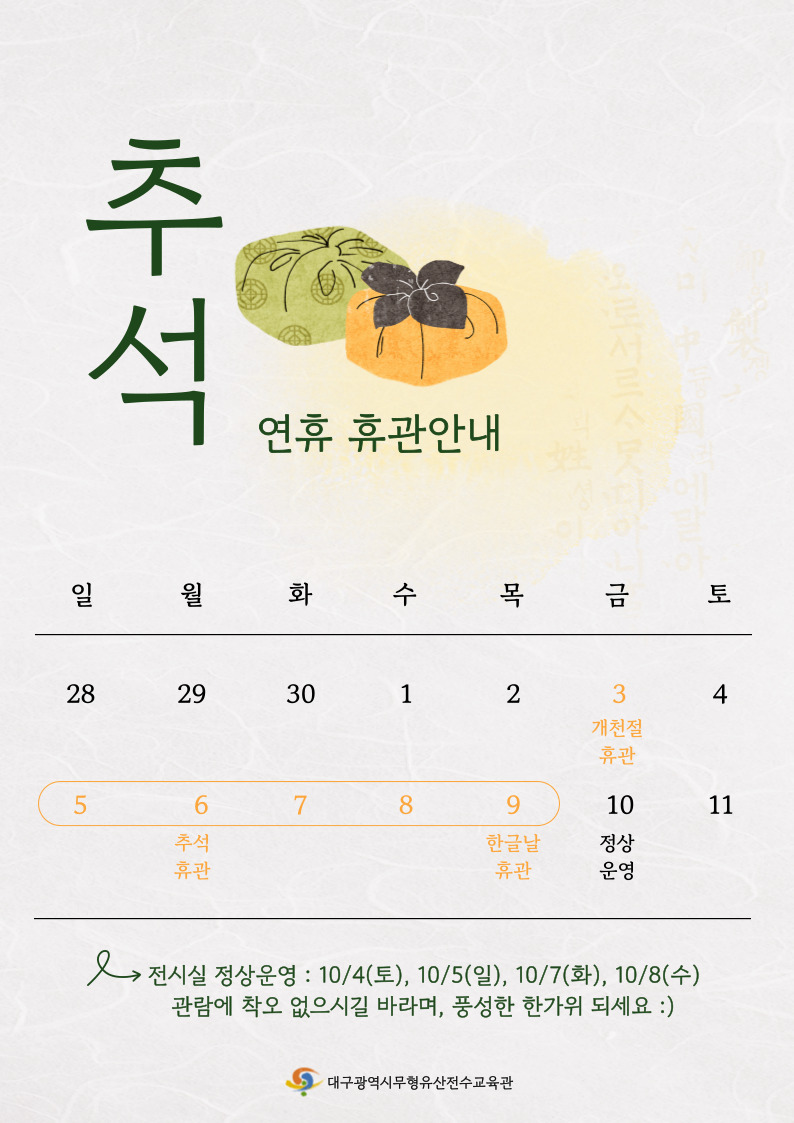 10월, 대구무형유산전수교육관 휴관 일정 안내드립니다