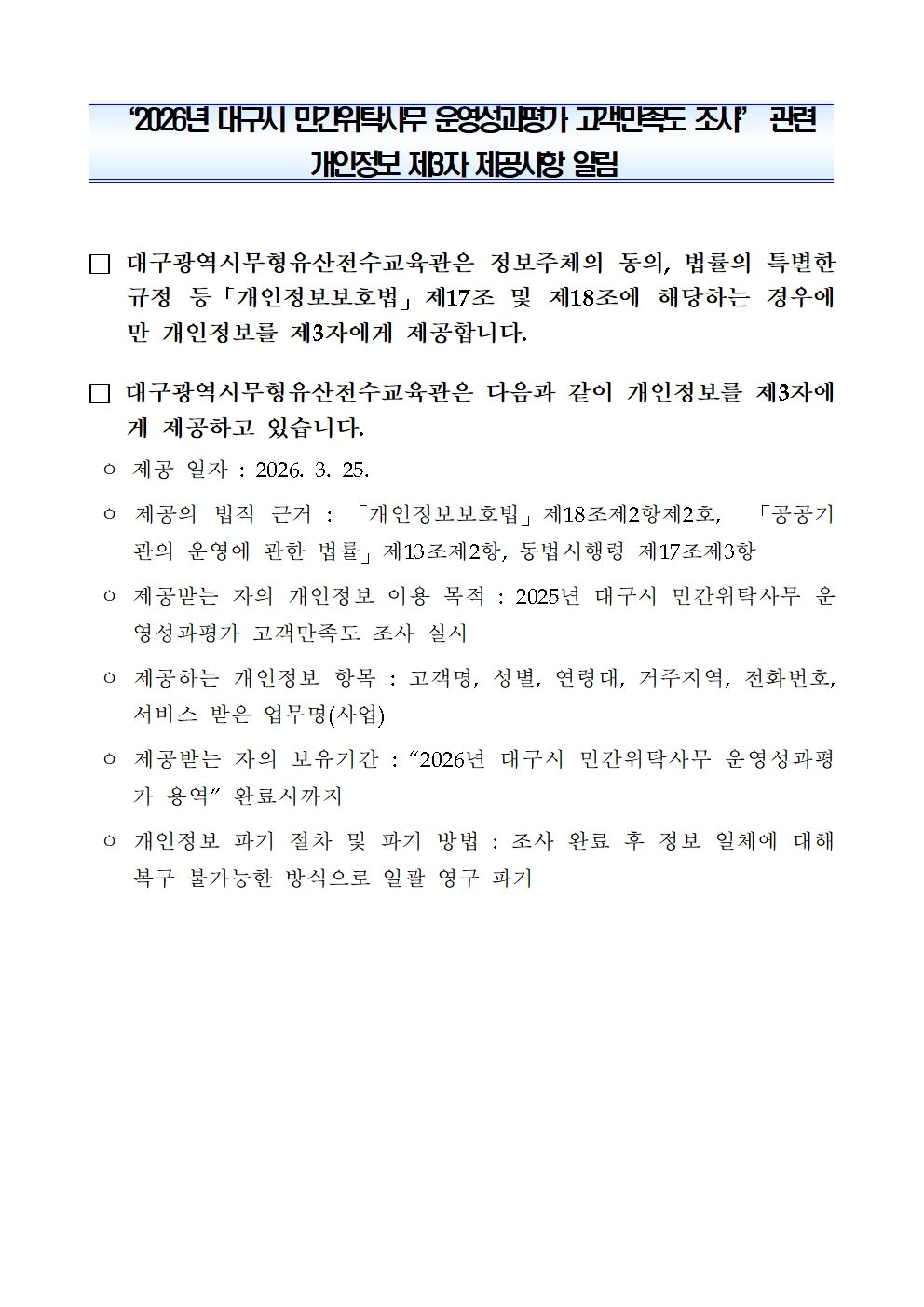 2026년 민간위탁사무 개인정보 제공 안내문